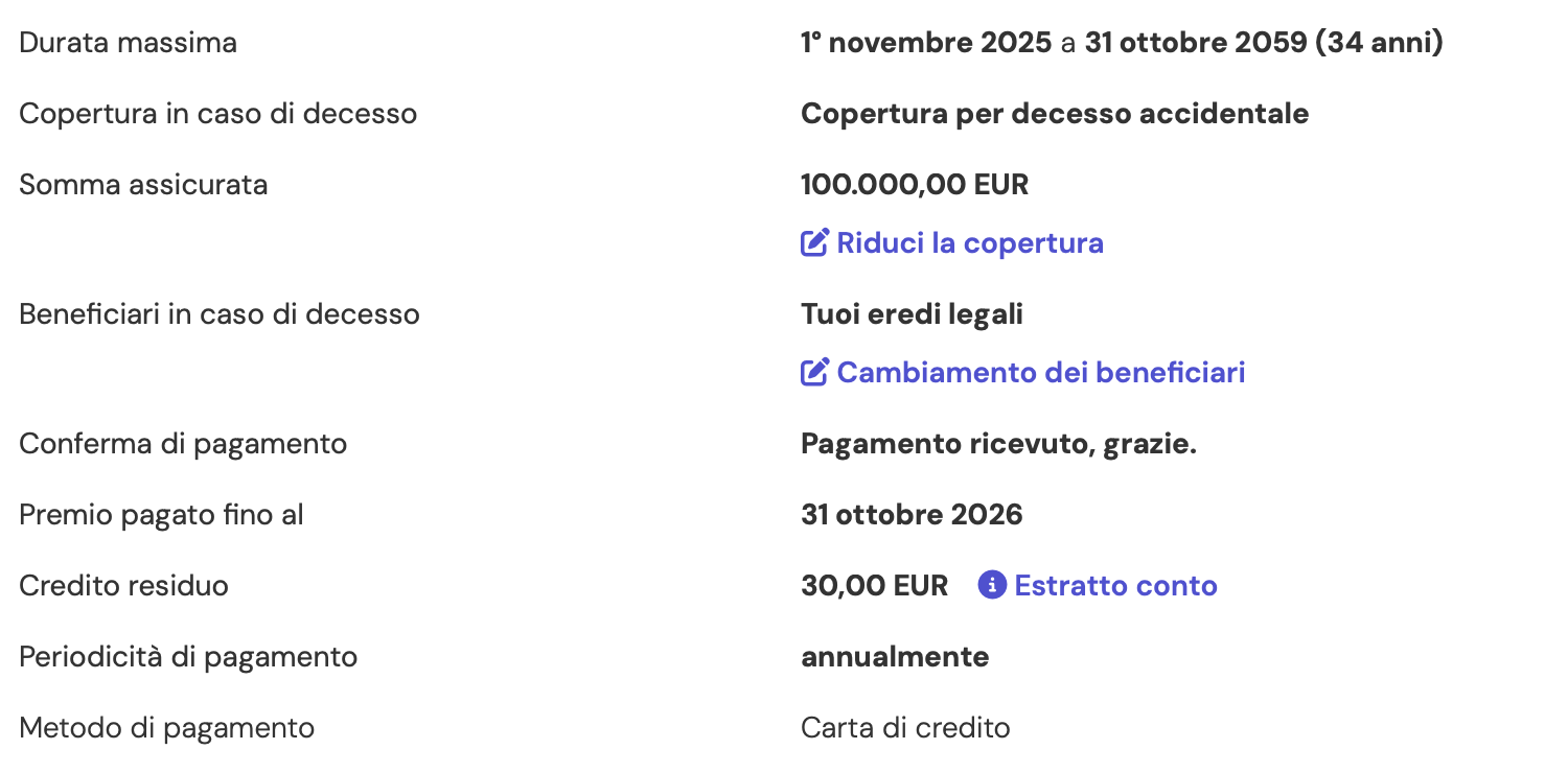 Come potete vedere i massimali quelli sono. Chiaramente il decesso non deve essere causato da malattia, come nelle maggior parte delle polizze. Ma soprattutto i 100k sono erogati in determinate condizioni. Non sempre si incassa il premio massimo, vi invito a leggere il DIP completo per il dettaglio in tal senso.